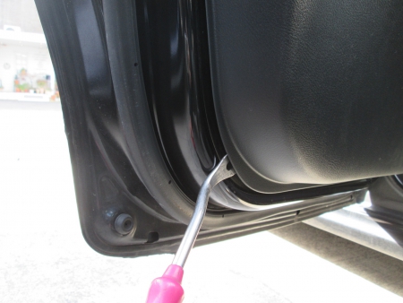 ビスを外したら、内張りの間に道具をさしこみ外します。