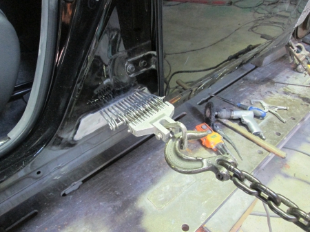センターピラーのヘコミのある所に専用のワッシャーを溶接して引き出します