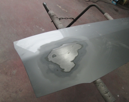 塗装を剥がしハンマーと当盤、スタット溶接機と言う機械を使って鈑金をします
